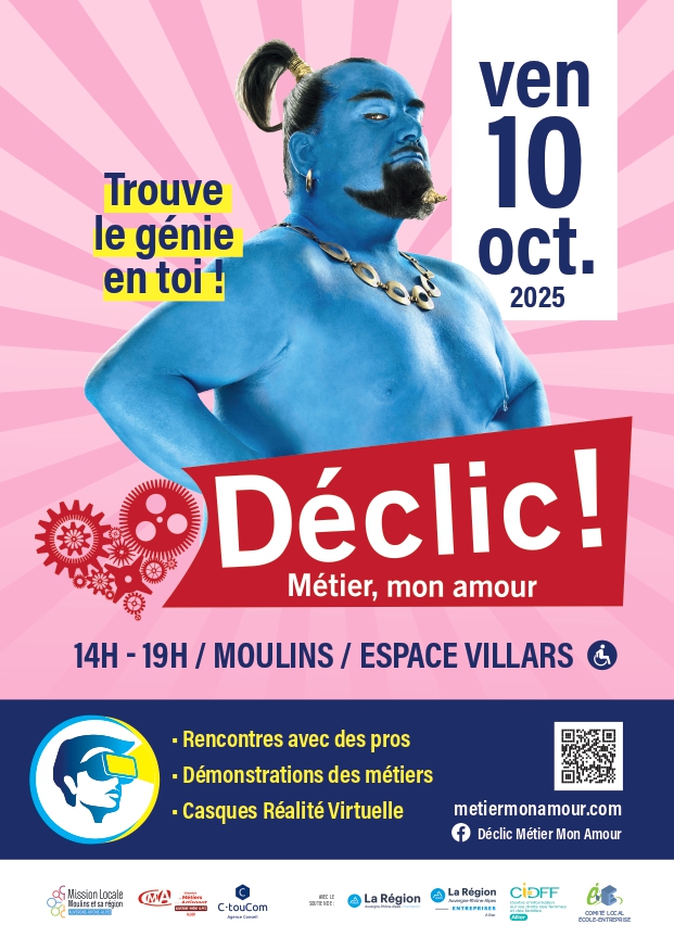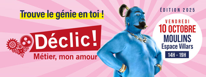Nous vous informons que le Forum Déclic se tiendra le vendredi 10 octobre 2025 de 14h à 19h à l'Espace Villars de Moulins.